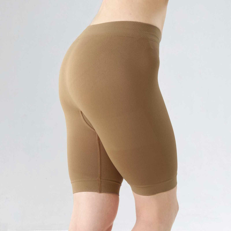 ・全体を吸水速乾糸で編み立てており、長時間座っていても、気になるお尻や太もも部分の汗をサラッとガード!! ・太ももとお尻部分は、2重編みでリブ調になっており、タオルのような柔らかく気持良い肌触りで汗を吸収します。 ・心地良い締め付け感で、内太もも部分の気になるお肉をサポートし、「編み立」なのでボトムやレギンスにも響きにくい仕様になっています。 ・もちろんこれ1枚でショーツとしてもお使いいただけますし、お手持ちのショーツの上からガードルとしても着用していただけます。