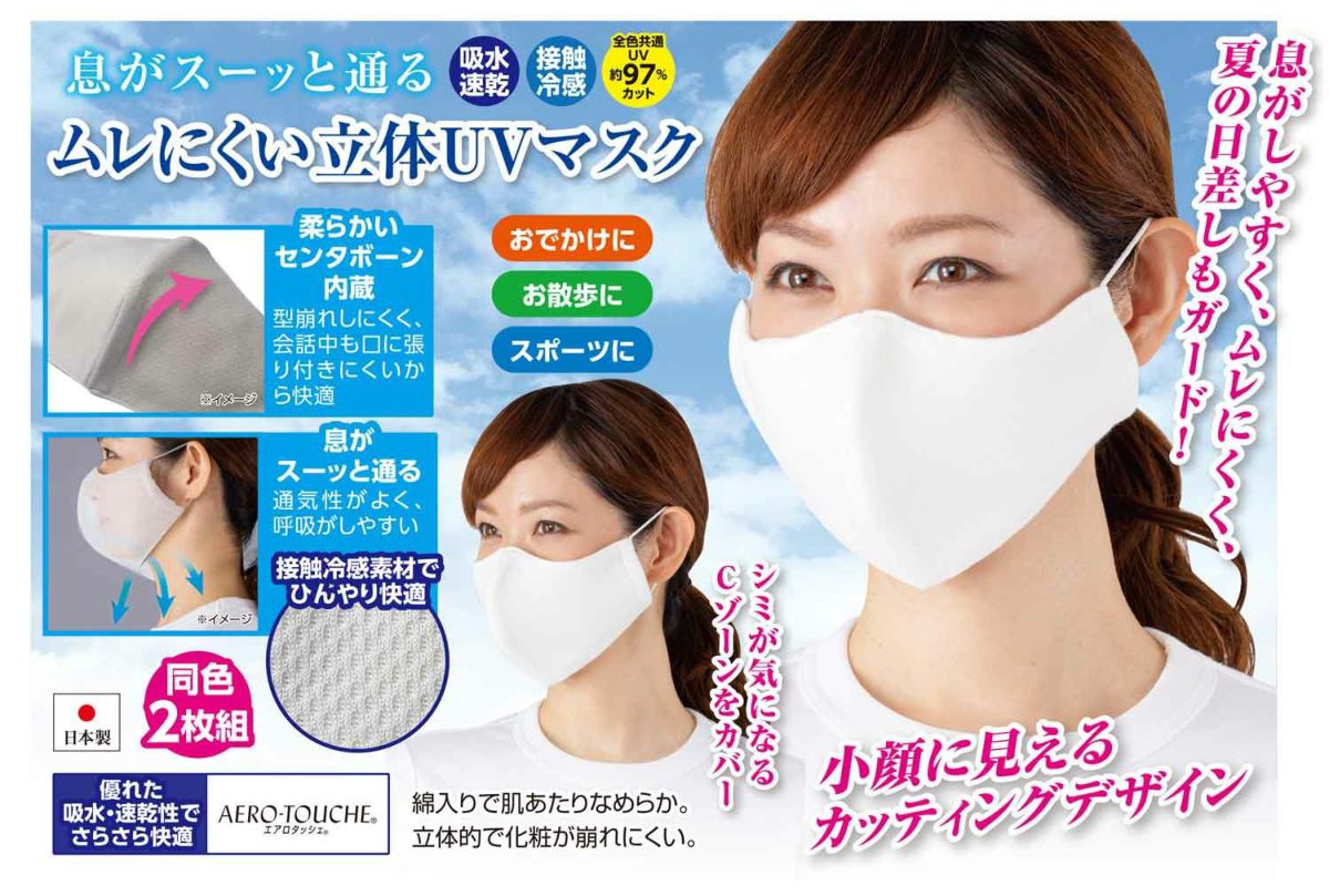 他の画像を見る 息がスーッと通るムレにくく、肌に優しい立体UVカット機能付きフェイスマスク!UVマスク 日よけ ひんやり 洗える 息がラクな立体UV冷感マスク2枚組 ¥ 1,980 税込 カートに入れる お気に入りに登録する