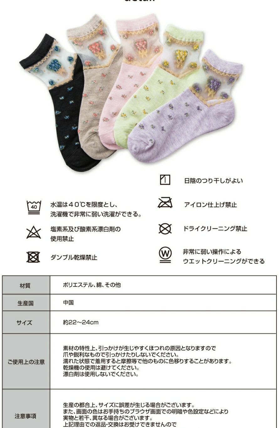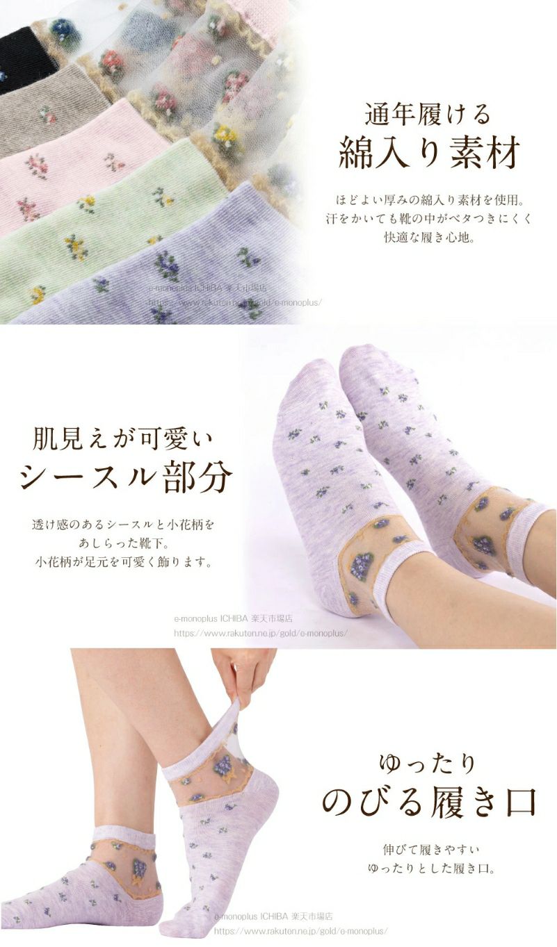 他の画像を見る 人気 5足組 お買得【送料無料】 足元爽やかな通気性の良いシースルーソックス 蒸れない 綿混 コットン 綿 靴下 レース ソックス ミセス ギフト 敬老の日 小花柄シースルーソックス5色組 ¥ 2,387 税込 カートに入れる お気に入りに登録する
